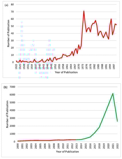 Publication by Year; (a): Documents by Year on Digitalization (1922–1999), (b): Documents by Year on Digitalization (2000–2022) [65].