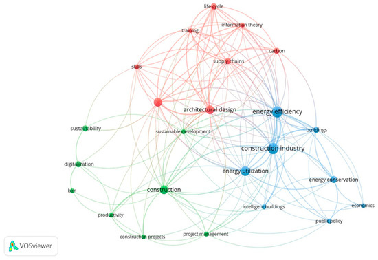 The keywords are one of the main aspects of any published work which demonstrates the thrust of the conducted work. Here, the role of keyword analysis plays a vital part in research as it defines the linkages among the conducted work, and also clarifies the pattern of the work. For keyword analysis purposes, VOSviewer software was utilized to observe the co-occurrence of the keyword. Figure 6 shows the linkage of each keyword with other keywords, while Table 2 shows the number of co-occurrences of each keyword along with the designated cluster. The red color represents cluster 1, the green color represents cluster 2, while the blue represents cluster 3. All of these three clusters are interconnected with the keywords, showing the connections of the articles. It can also be noticed that the highest co-occurrence came as ten for the “construction industry” and “energy efficiency” keywords, followed by eight and seven co-occurrences for “energy utilization” and “(architectural design, building information modelling, construction)”, respectively.