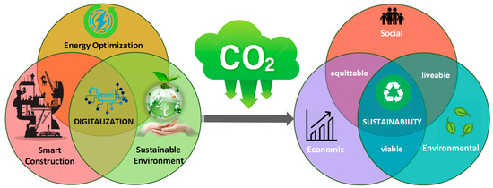 Recently proposed methods used digital technology for the development of the construction sector, optimization of energy, sustainable environment, smart construction to offer a better quality of life, economic and architectural growth, wireless technology for effective communication, and maintenance of buildings. Specifically, the BIM system is being implemented in several construction-related areas for various purposes such as reduction in carbon emissions, and the use of BIM to create a sustainable environment through digitalization. It is regarded as a cornerstone in the digitalization of the building industry and has demonstrated potential for greening cities by creating models that can perform environmental analysis. BIM has its efficiency in smart construction by providing effective frameworks that can offer a good quality of life with automation and smart technologies. BIM has also been applied for the advanced monitoring of sites using wireless sensor technology, and its use can be seen in the renovation process. BIM mitigates the chance of a lack of information and offers an easy flow of knowledge. Although, there is still a need for different training programs to raise or strengthen the workers’ skill levels. Data is enhanced through digitization, which also makes it easier to access and connect with other networks, and facilitates maintenance and quality monitoring. It improves communication, and productivity, and enhances managerial tasks. Similarly, IoT demonstrated its strength in the shift from manual to automatic industry. IoT technology offers enormous promise for boosting on-site safety, operational effectiveness, and productivity. It helps in providing security and protection through various applications, and offers effective communication through wireless technology. Tracking of real-time data and analysis of the progress of work is made possible through digitalization. Overall, this technological advancement can transform various aspects of the construction. It will offer more productivity and can offer the automation of the sector with improved efficiency. Based on the indicated argument, a conceptual framework has been mapped showing the impact of digitalization on sustainability aspects. Figure 7 shows how digitalization is involved in different fields which are improving the quality of life of the end user. Digitalization has a direct impact on all the aspects of sustainability, from economic to social and environmental. With digitalization, not only the quality of life is enhanced, but it also reduces CO2 emissions.