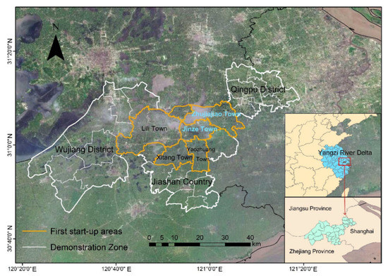 The Yangtze River Delta is one of the regions with the most active economic development, the highest degree of openness and the strongest innovation ability in China, and plays a pivotal role in the national economy. For example, the Yangtze River Delta region only covers 4% of the national area, but accounts for 16.7% of the domestic population and contributes a quarter of the national GDP. In November 2018, the integrated regional development of the Yangtze River Delta region officially rose to a national strategy. In 2019, the National State Council approved the plan of the Yangtze River Delta Eco-Green Integrated Development Demonstration Zone (referred to as Demonstration Zone). The Demonstration Zone includes Qingpu District in Shanghai, Wujiang District in Suzhou City, Jiangsu Province, and some areas in Jiashan County, Jiaxing City, Zhejiang Province (Figure 1), which covers an area of about 2413 square kilometers [1]. At the same time, five towns in three districts and counties were selected as the first start-up areas, with an area of about 660 square kilometers [2]. Among them, Shanghai involves Jinze town and Zhujiajiao town, in Qingpu District.
