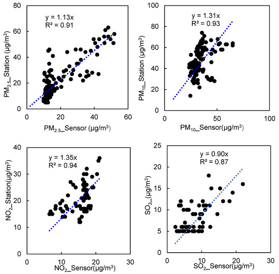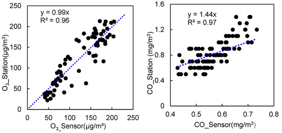 Firstly, the calibration experiment of the portable instrument was carried out before using it. We placed the portable monitor at an automatic ambient air quality monitoring station for comparison. The automatic ambient air quality monitoring station (121.41° E, 31.17° N) was located on the rooftop of a six-floor building in Shanghai Normal University, and it released real-time hourly concentrations of PM10, PM2.5, SO2, NO2, O3 and CO. Data obtained from the portable instrument were calibrated. Figure 2 shows the comparison of data between the automatic ambient air quality monitoring station (Station) and the portable sensor monitor (Sensor). PM10, PM2.5, SO2, NO2, O3 and CO were measured by the portable sensor monitor and show good correlation with that by the automatic ambient air quality monitoring station, with a correlation coefficient (R2) of 0.87~0.99; this indicated that the portable sensor monitor could capture a variation trend in the pollutants.