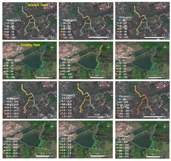 The spatial variation in pollutants in the Ancient Town and the Country Park is depicted in Figure 3. To eliminate the interference of background concentrations of pollutants, we selected the observations with similar air quality to compare the pollutant concentrations in the Country Park and the Ancient Town. For example, daily concentrations of PM2.5 in Qingpu District on 17 August and 18 August were very similar (21 μg/m3 and 22 μg/m3, respectively). PM2.5 in the country park mostly ranged from 15 to 20 μg/m3, and that in the Ancient Town ranged from 20 to 50 μg/m3. PM10 in the two areas were comparable. It is inferred that soil dust caused by agricultural activities is the main source of PM10 in the country park and dust resuspension is the major source of PM10 in the Ancient Town. SO2 level in the Ancient Town was obviously higher than that in the Country Park. Similarly, NO2, CO and O3 in the Ancient Town were higher than that in the Country Park. Affected by the high intensity of human activities, the concentration of the six key pollutants in the Ancient Town is usually higher than that in the Country Park. To investigate the impact of residential emission on air pollution in the country park, the mobile monitoring route extends to the inside of Lianhu Village, as shown in Figure 4. Primary pollutants, including SO2, NO2 and CO, around Lianhu Village were higher than that in other areas of the Country Park. SO2, NO2 and CO were probably emitted from the burning of household solid fuels, which includes coal and firewood.