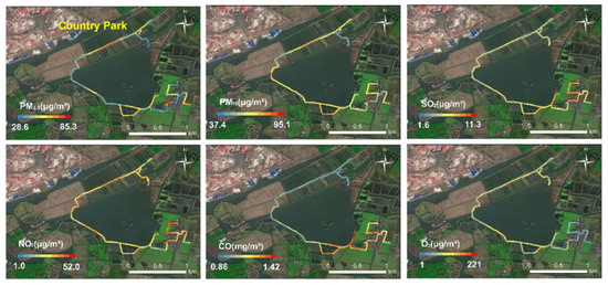 Spatial variation in pollutants in the Country Park (12:00–14:00, 24 July, observation numbered 7 in Table S1).