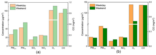 The response of pollutants is closely related to human activities. Comparison of pollutants in weekdays and weekends at the Ancient Town and the Country Park are depicted in Figure 5. Weekdays include Wednesday and Thursday (12:00–14:00 and 16:00–18:00, 17–18 August) and weekends include Saturday and Sunday (12:00–14:00 and 16:00–18:00, 20–21 August). The air quality in Qingpu District during the studied weekdays was comparable with that during the studied weekends. For example, the daily concentrations of PM2.5 in Qingpu District on 17 August, 18 August, 20 August, and 21 August were 21 μg/m3, 22 μg/m3, 24 μg/m3 and 26 μg/m3 Data source: https://sthj.sh.gov.cn/ (accessed on 1 November 2022). The concentrations of PM2.5, PM10, SO2 and CO in the ancient town during weekends were higher than that during weekdays (Figure 5a). NO2 levels in the Ancient Town during weekdays and weekends were similar. The results were different from the variation in pollutants in typical urban areas during weekends and weekdays. Lower concentrations of pollutants, especially NOx, were usually observed during weekends when compared with that of weekdays [21,22,23]. The higher concentration of pollutants in the Ancient Town during weekdays was closely related to the increased volume of visitors. Concentrations of pollutants in the country park presented no consistent variation between weekdays and weekends (Figure 5b).