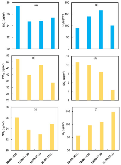 PM10 in the country park presented relatively higher concentrations during 08:00–10:00 and 16:00–18:00, which was probably associated with agricultural production activities. On the contrary, PM10 in the country park displayed the lowest concentration during 20:00–22:00. A lower concentration of PM10 was observed during 12:00–14:00 due to the highest temperature at noon, and consequently less anthropogenic activities. Concentrations of SO2 in the country park were relatively high during the day and sharply decreased during 20:00–22:00, which was likely related to emissions from residential activities, such as cooking powered by coal or wood combustion, or agricultural activities in the daytime.