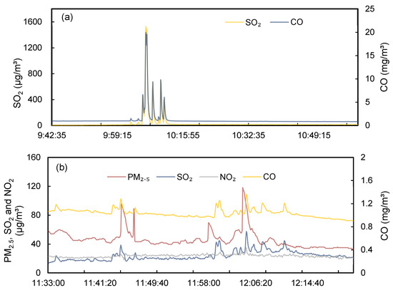 With the rapid response of mobile monitoring observation, emission sources were identified in the field from case studies, as illustrated in Figure 7. The time series of typical pollutants in case studies are displayed in Figure 8. In the country park, agricultural irrigation, which is powered by diesel combustion, was identified as one of emission sources in the country park (Figure 7). The pollution case was characterized by an extremely high concentration of SO2 and CO, with the real-time maximum concentration of SO2 and CO up to 1530 μg/m3 and 20 mg/m3, respectively. A similar pollution case, caused by agricultural irrigation, was also observed during 14:00–16:00 on the 18 August in the country park (Figure 3). Yasar et al. conducted a comparison of pollutant emissions from different fuel and engine types, and found that SO2 emissions were highest for diesel [27]. Zhang et al. investigated emission factors for gaseous and particulate pollutants from diesel engine vessels, and found that the highest CO was observed in idling mode [28].
