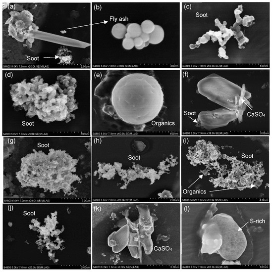 Surface morphology and sizes of individual aerosol particles from SEM analysis in the Ancient Town and the Country Park are depicted in Figure 9. Li et al. reviewed the morphology, mixing state and source of various single particles in East Asia; this was referred to in this study, in order to identify aerosol types due to a lack of EDX analysis [33]. Abundant soot particles, usually emitted from the incomplete combustion of fossil fuels and biomass, were identified in both areas (Figure 9c,d,g–j). Soot particles, also referred to as black carbon (BC), are chain-like aggregates of carbon-bearing spheres with typical diameters from 10 to 100 nm [34]. Fresh soot particles were branched (Figure 9c,j) and will become more compact (Figure 9d,g) during transport and aging [35,36]. Fly ash (Figure 9b), mainly containing Al and Si, is typically produced by coal combustion for cooking, heating, industrial activities, and power plants [33]. Figure 9e shows one spherical primary organic particle. The sulfur-rich particles, which are secondarily formed from SO2, have a special morphology in the electron microscope, and usually appear as foam (Figure 9l). Figure 9f,k were inferred to be aged mineral (CaSO4), which could be produced from calcite and dolomite reacting with acidic gases (e.g., SO2) [33]. In summary, the morphology analysis of the aerosol particles indicated that air pollution in the two studied areas was affected by local emissions from small scale activities and regional transport.