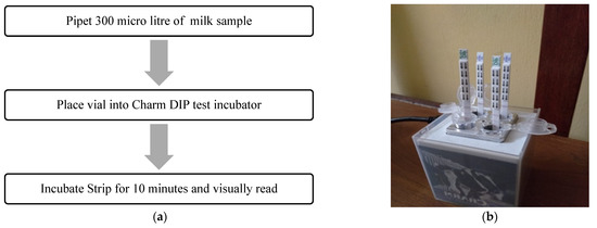 (a) Test procedure for processing milk samples by Charm ROSA Dip Kit; (b) actual picture of using Charm ROSA Dip test kit.