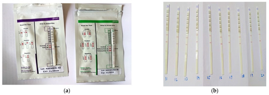 The evaluation and screening of the milk samples by rapid action test kits, using a lateral flow technique, was performed for the detection of aflatoxin M1 and antibiotic residues at ICAR-Central Island Agricultural Research Institute, Port Blair, using a Charm ROSA test [15] (Figure 2). This is one of the easiest methods for rapid detection of contaminants in milk [16]. The screening results can be obtained in a short time [17], and the test is both highly sensitive and able to detect even low concentrations of residues [18,19]. The lateral flow-based test has a high sensitivity and specificity (15). A semiquantitative lateral flow-based rapid one step assay (ROSA), produced by Charm Sciences, was tested in an interlaboratory study and found to be efficient tool for screening samples; it revealed only 4.8% false negative results [17,20]. A 300 µL milk sample was taken in a vial using a dropper supplied with the kit. Afterwards, the vial with the sample was placed in the CHARM Dip test incubator. The test strip was added to the vial and incubated for 8–10 min. After incubation, the strip was compared to the standard comparison sheet supplied with the kit, and visually read. The selection of antibiotics for the present study was based on a review of the commonly used drugs for treatment of the dairy animals in the islands. It was found that tetracycline and sulfonamides were the most commonly used antibiotics, and thus, these were screened in the milk samples.