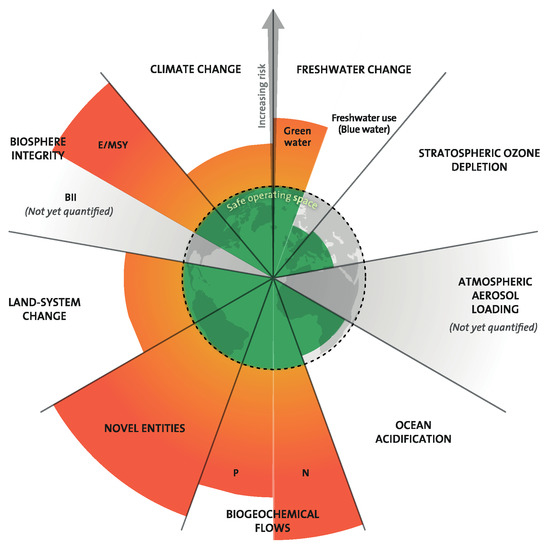 - Steffen, W.; Richardson, K.; Rockström, J.; Cornell, S.E.; Fetzer, I.; Bennett, E.M.; Biggs, R.; Carpenter, S.R.; de Vries, W.; de Wit, C.A.; et al. Sustainability. Planetary boundaries: Guiding human development on a changing planet. Science 2015, 347, 1259855. [Google Scholar] [CrossRef] [PubMed]