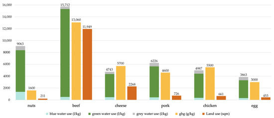 Environmental impact of nuts, beef, cheese, pork, chicken and eggs. Water use (blue, green, grey and total), greenhouse gas emissions and land use of selected products. The data were collected from several publications [10,11,14,19,23].