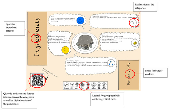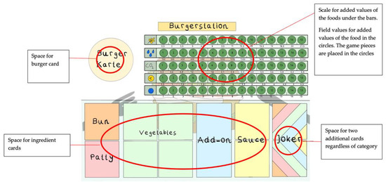 The game consists of two different game boards, game pieces, multipliers, burger cards and ingredient cards that were created independently (Figure 3). In the middle of the game setup is an information board (Figure 4 and Figure 5). On the information board are fields for storing the ingredient or burger cards, as well as a legend explaining symbols and a QR code to the e-book. In addition to concise explanations of the categories taken up in the game.