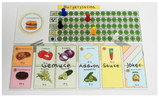 To design the ingredient cards, the most common ingredients of a burger were selected as well as all conventional meat and meat substitute products. The selection of ingredients was based on the ingredients listed on the menu of the most common fast food and burger restaurants in Germany. Common serving sizes were identified and used for researching the data. To generate the game data, values for CO2 equivalent, water use, land use and price were researched. For products consisting of one ingredient, various publications exist on resource consumption with differentiated values listed in some cases [14,19,20,23,34,35]. Products based on multiple ingredients are sometimes not listed in the literature. For this case, the game data were obtained from the values of the individual ingredients. Only approximate values could be determined, since, for example, the type of production, country of origin and preparation method are difficult to include in the calculation. In terms of water consumption, in particular, the difficulty is to combine the green, blue and grey categories into one value in order to make appropriate comparisons between the products. For these reasons, averaged values from different sources were generated for each ingredient. The listing can be found in the Supplementary Information.