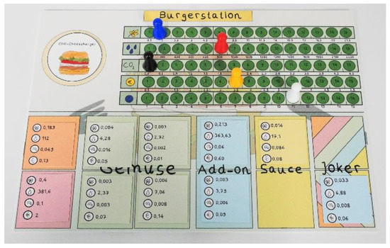 Every person takes a burger card and puts it on the field in the top left of the game board “burger station”. In this example, the player chooses a cheeseburger. On the back of the burger card is a description that cheese or vegan cheese is mandatory on the burger. All other ingredients can be chosen freely. Time by time the fields “bun”, “patty”, “vegetables”, “Add-on” and “sauce” are filled with: sourdough buns, vegan cheese, lettuce, avocado, onion, veggie patty and hamburger sauce. After choosing these ingredients, the player turns the cards. On the back are the values for ghg, water consumption, land use and price. Then, the player puts the game figure onto the appropriate field. These points are then compared to the points of the other burgers in the game. In this example, the hamburger gains 46.5 points and the vegan burger 7 points. The details can be seen in Figure 10 and Table 1. The vegan burger wins. It can be figured out which ingredients are more responsible for a higher score than others. In the second round, the burger can be optimized and rated again.