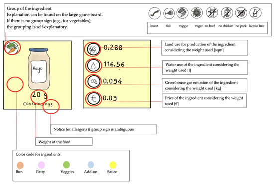 The ingredient cards are divided into the five components of the burger and can be distinguished from each other by a colour code (Figure 9). They also consist of a front and a back. On the front, the name of the ingredient, the mass, references to animal ingredients and a drawing are shown, as well as a symbol for membership in the groups: vegan, vegetarian, fish, beef, chicken, pork and insect. Dairy products are also indicated if they are lactose-free. On the back of each ingredient card are the values for land use, water consumption, CO2 equivalent and price, based on the mass of the respective ingredient.