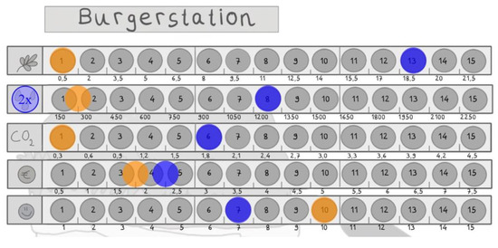 Each player gets their own playing field, the so-called “burger station” (Figure 5, Figure 6 and Figure 7). There are three areas: space for the burger cards, storage for the ingredient cards and a scale for transferring the values. Each category has 15 fields in the scale with linear values that are adjusted to the level of the ingredient values. To further increase the range of values, there is an option to multiply a scale by a factor of two. For example, a double beef patty and a veggie patty differ in water consumption with a difference of 100 L and 3700 L. The multiplicator makes it possible to represent each burger creation in values.