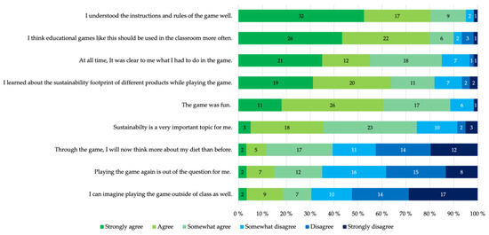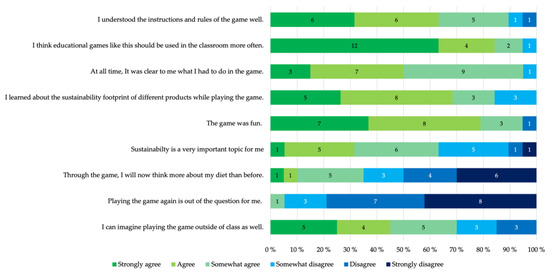 Overall, the game scored very well in all questions. To check the general interests of the students in sustainability, they were asked to indicate whether sustainability is an important topic for them. The majority in both groups agreed with this statement (about 70% in group 1 and over 60% in group 2), with disagreement filling the range from value 1 to 3 and agreement filling the range from value 4 to 6. Both groups also understood the instructions and agree that such educational games should be used more in the classroom—over 80% in group 1 and 90% in group 2. In addition, the instructions were clear to group 1 with over 90% agreement, and most participants were aware of what to always do (over 80%). Moreover, the participants felt that they learned something about the sustainability of different foods, which is reflected in the agreement with the statement of about 80% in both groups. As an important criterion of games, Burger.i.doo was fun to the participants (over 80% in group 1 and 90% in group 2), although the game had less effect on participants thinking more about their diet than before. Group 2 also disagrees with over 90% that the game should not be played again—in group 1, this is around 45%. Furthermore, in group 2, 70% can imagine playing the game outside the classroom. The graphical representation of the results can be seen in Figure 11 and Figure 12.