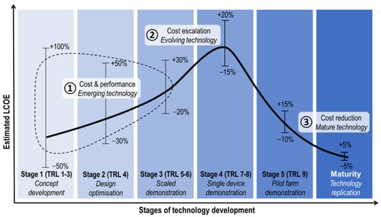 The detailed bottom-up techno-economic approach is the most common costing method used for energy technologies. Some future LCOE projections found for wave energy technologies are Oscilla Power’s Triton [], M3 Wave [], UGEN [], or Sandia’s Reference Model Project []. In this approach, the design of the wave energy device and balance of plant and array layout, together with the corresponding technical and operational performance parameters, are specified. Based on this information, the capital expenditure (CAPEX) and operational expenditure (OPEX) costs are estimated for a particular deployment site. This cost is then aggregated with other costs such as project development, insurance, and decommissioning costs, and, as a result, an LCOE is obtained. However, this direct method of estimating the future cost of a commercial-scale technology is only suitable for technologies that are close to commercialisation and whose design is well defined. Experience demonstrates that cost estimates for emerging technologies tend to be rather optimistic and significantly lower than the actual cost of the first commercial plant deployed []. As the design is further detailed and unforeseen technological issues uncovered in the development process, the estimated costs of these technologies tend to escalate. Subsequently, the relatively high cost of early deployments declines as the technology is replicated and learning is capitalised through more efficient designs and processes.