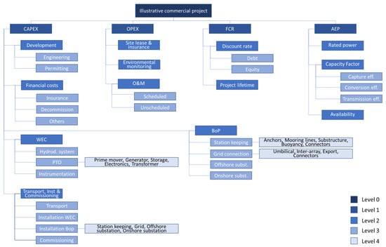 The standardised cost and performance breakdown used in this work is shown in Figure 2 to the fourth level of detail. It builds upon several published guidance documents and tools such as the US Department of Energy reporting guidance [], BVGA ocean energy value chain study [], the COE Calculation Tool commissioned by the Danish Transmission System Operator [], or the DTOceanPlus design tools []. These guidance documents are useful to avoid omitting any relevant cost centre.