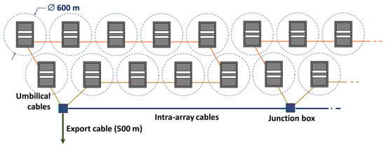 For the estimation of future costs, a wave energy farm model is created representing an illustrative first commercial project of 50 units. Considering that rated capacity for utility-scale wave energy technologies usually ranges 200–1500 kW [], this means between 10 and 75 MW in total. The array size lies in the range of the capacity used for cost estimation of commercial farms []. The wave farm model should describe deployment site characteristics, water depth, distance to the shore, and other design parameters used.