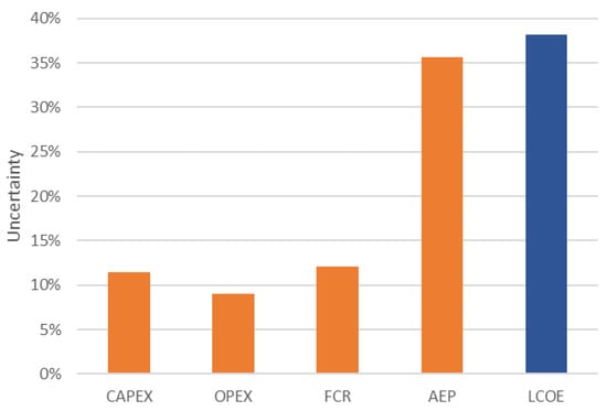 The uncertainty estimation in the LCOE is not direct, but it is calculated by means of its formula involving CAPEX, OPEX, FCR, and AEP. In turn, each of these factors were derived in Step 1 using basic parametric relationships. Error propagation is used to calculate the aggregated uncertainty in a cascading manner from the lowest level of the standard cost and performance breakdown. For instance, the structural cost of the hydrodynamic system can be calculated from three techno-economic variables: the unit cost of the main raw material (EUR/kg), a coefficient to account for the manufacturing complexity (-), and the structural weight (kg). Ranges of uncertainty in the material unit cost (exogenous factor), maturity of manufacturing processes (suppliers’ capability), and estimation of the structural weight (design accuracy) will determine the aggregated uncertainty in the estimation of the hydrodynamic system cost, in this case, the geometric mean of the standard deviations. This estimate in turn will be combined with other capital expenditures to derive the uncertainty in the WEC, farm CAPEX, and finally the LCOE.