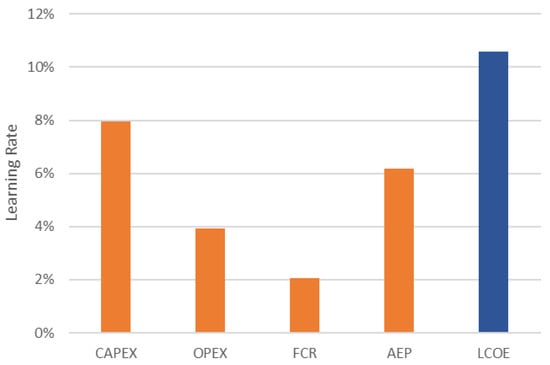 The independent variable x in Equation (5) reflects all the factors that influence the cost trajectory of the technology. Often, combinations of technological learning occur at each stage, and their contributions may change during the development of a technology over time. Furthermore, single-factor learning curves do not necessarily describe the underlying factors of cost reduction []. Some components and subsystems in wave energy farms, such as electrical infrastructure and offshore operations, are not entirely new to the market. They build on the experience gained from more mature sectors, a disaggregated approach that can account for individual learning effects at the component level leading to improved cost reduction estimations for emerging technologies which lack historical data. This can take advantage of past learning rates for direct comparable technologies in order to build a composite learning rate. In addition, it can break apart the impact of raw material spending (an exogenous parameter) from other cost reductions due to cumulative experience.