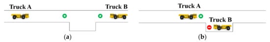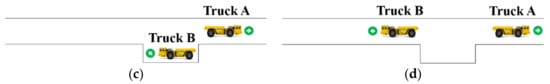 Truck avoidance process. (a) Truck A meets truck B. (b) Truck B avoids truck A. (c) Truck A goes through the tunnel. (d) Truck B goes through the tunnel.