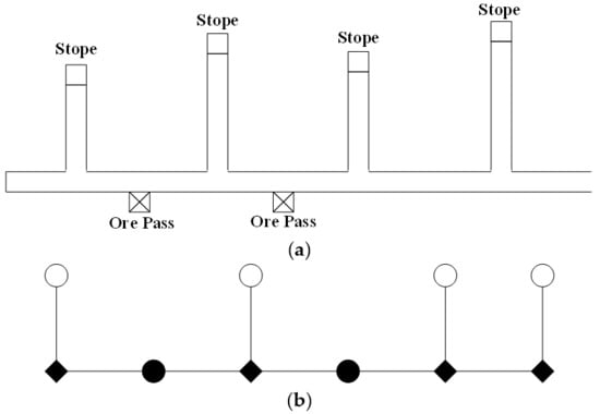 In network modeling, the transportation network is simplified and expressed using symbols. Figure 3a shows an example, and Figure 3b shows the schematic diagram of drifts in a mining area, where ◯ represent loading locations, ◆ represent junctions, and ● represent unloading locations.