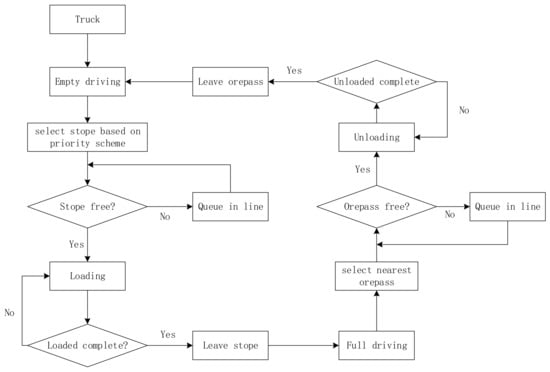 Truck transportation is a circular process, and a truck’s loading location is not limited to a specific stope, nor is its unloading location limited to a specific ore pass. The logic model of ore transportation here proposed focuses on analyzing the ore transportation process, as shown in Figure 5. The model fully considers the dynamic characteristics of trackless transportation equipment. The modeling strategies include stope priority, distance priority, and queuing priority. The performance of all loaders and trucks is assumed to be the same, so that they can be allocated with the same possibility.