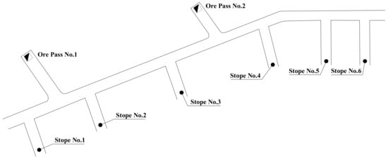 An underground gold mine located in Shandong Province, China, that adopts the backfilling mining method was used as a case study. The development of shafts, declines, and drifts is designed to haul ore and waste. Trackless vehicles are used in a wide range to transport ore from stopes to ore passes. An optimization simulation model was established based on the trackless transportation process at the −375 m level. Shovel loaders Atlas Copco ST 3 are used for loading ore or waste, and dump trucks ASJK-12 are used for transporting ore or waste. Trackless vehicles drive along drifts as shown in Figure 7. There are six stopes and two ore passes in this mining area. Currently, the ore of stopes 1, 2, 3, and 4 has been extracted and is stocked in situ.