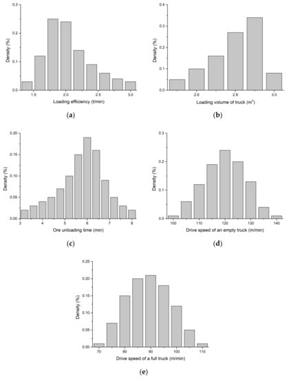 It is necessary to collect and analyze the production data when a transportation simulation model is established. The bucket volume of Atlas Copco ST is 3 m3, and the loading capacity of ASJK-12 is 12 tons. Due to uncertainties that may occur during mining operations, the parameters of the efficiency of vehicles, speed of movement, and loading time can fluctuate within a range. Through the investigation of mining data on-site, the probability distribution of each parameter was obtained statistically, such as the efficiency of the loader in loading ore or waste, the discharge time of the truck, and the average driving speed of the truck when empty and fully loaded, as shown in Figure 9.