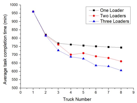 Average task completion time changes with different numbers of loaders and trucks.