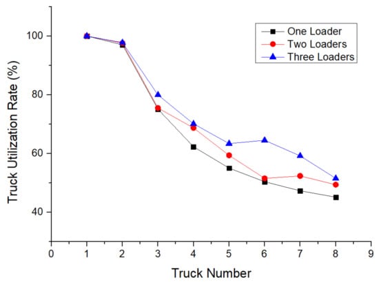 Average truck utilization rates with different numbers of trucks and loaders.