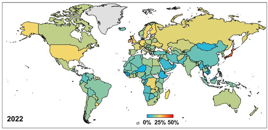 As Figure 6 illustrates, Brazil shows the highest level of storage losses among the ten countries in the category of dams under 1 million m3, while the Canadian dams have the lowest storage losses in this category. A 19% increment in storage losses between 2022 and 2050 has been estimated for Brazil and Spain, the highest in this category, while the USA shows the lowest increment of 4%. China, the owner of the largest number of dams irrespective of capacity, shows a 10% loss increase and is positioned in the sixth among the ten countries under the category of dams with less capacity than one million m3. At the same time, it is the lowest storage-loss country in the category of dams, with over 1 million m3 dams. In the category of dams over 1 million m3, as shown in Figure 7, Japan appears to have the highest percentage of storage loss by 2050, and most countries in this category show about a 10% increment of losses between 2022 and 2050. Overall the category below 1 million m3 demonstrates more significant storage losses than the one over 1 million m3. However, as evident from the LRs employed, as explained in Table 1, Wisser et al. [10] concluded that dams with smaller storage have higher storage losses due to sedimentation. The illustrations above support and reflect that conclusion.