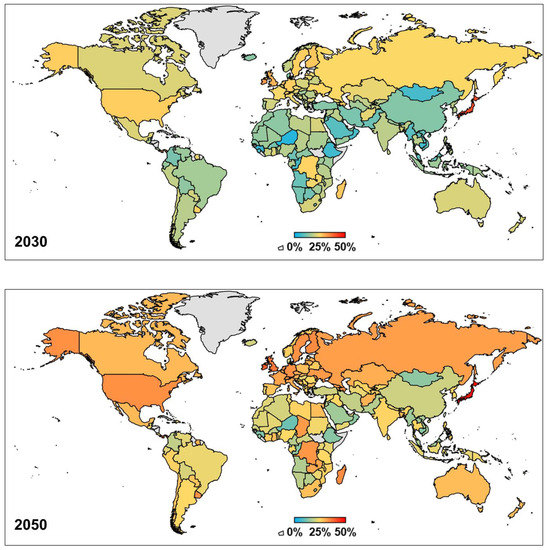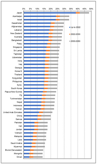 After Japan, Azerbaijan (24%), Israel (24%), Kazakhstan (20%), and Afghanistan (20%) have had the highest rates of storage losses till the present (2022). The exact order continues up to 2050, while Cambodia, Bhutan, Oman, Mongolia, and Brunei will have the lowest storage loss percentage of 14% by 2050. In Asia, the region where 60% of the world’s population lives, water storage is crucial in sustaining water and food security. It will face a more challenging future if it loses 23% of its water storage in large dams due to sedimentation. At present (2022), Japan is the only country that has lost over 25% of its initial storage in the Asia-Pacific region. By 2050—in just 28 years from now—there will be 23 such nations in the region. This includes developed countries such as Australia, Japan, New Zealand, and South Korea, as well as the least developed countries such as Afghanistan and Bangladesh (Figure 5). Among these 23 nations are highly populated countries such as India and Bangladesh. India’s Central Water Commission (2015) reported that among 141 large reservoirs over 50 years old, one-quarter had lost at least 30% of their initial storage capacity. The present study suggests that 3700 dams in India will lose 26% of their initial total storage by 2050.