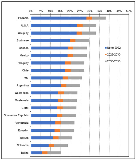 In this assessment, the Americas include 19 countries and 10,358 large dams, with a cumulative initial storage capacity of 2810 billion m3. This is estimated to decline to 2014 billion m3 by 2050 (a decrease of 28%). Although the USA, Mexico, Brazil, and Canada are the top four nations with large dams in the region [2], Panama appears to be the country with the highest storage loss (38%; Figure 2). A total of 21 dams in Panama were included in the assessment, with their initial storage of 9.5 billion m3. The projected reduction is to 5.9 billion m3 by 2050.
