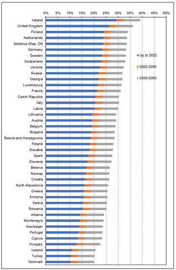 For Europe, 6651 large dams from 42 countries were considered in the study. The total initial storage of those dams was 895 billion m3; however, Europe already lost 19% of it by 2022 and will lose up to 21% by 2030 and 28% by 2050. Europe “shares” the highest storage loss percentage by 2050 with the Americas. Among the 42 countries, 33 (~78%) will likely lose over 25% of initial storage by 2050 (Figure 3)—doubling its 2022 number and a significant number of such countries compared to other regions. A likely primary reason for this is that most dams are aged and have accumulated already (and will accumulate) more sediments. Ireland has the highest level of storage loss at all time horizons (e.g., 39% by 2050), followed by the UK, Finland, the Netherlands, and Moldova. Denmark has the lowest storage loss among the 42 countries. It would be 20% of its initial storage by 2050. Turkey, Iceland, Hungary, and Cyprus appear to be the other few least-impacted countries in Europe.