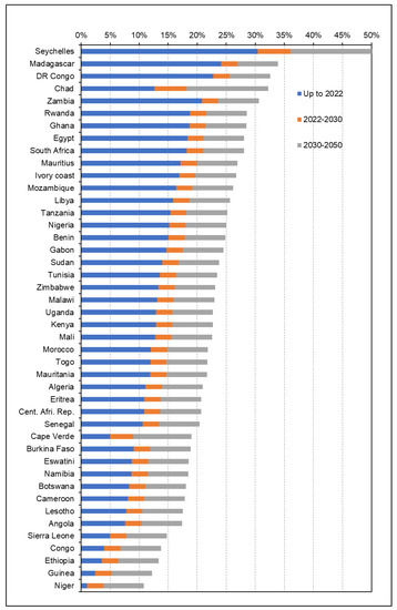 The estimated storage loss in Africa included 2349 dams in 44 countries with a total initial storage of 702 billion m3. At present, these dams lost around 15% of their storage. By 2030 and 2050, the cumulative loss of storage is estimated to reach 17% and 24%, respectively. Nine (9) and seven (7) dams in Chad and Cape Verde, respectively, were relatively young, with their average ages of 18 and 9 years. As a result, they showed limited storage losses by 2022, which will increase after that. Seychelles is projected to lose 50% of its storage by 2050-the highest in all regions (Figure 4). Seychelles has two large dams with cumulative storage of 1 million m3 and 48 years of average age. By now (2022), Seychelles is estimated to have lost over 30% of storage in these dams. By 2050, the same loss is estimated for Seychelles, Madagascar, DR Congo, Chad, and Zambia, while another 11 countries are estimated to have lost between 25% and 30%. The lowest storage loss by 2050 is estimated for Niger (11%), with minor storage loss at present. Other countries in Africa with small storage losses (under 15%) by 2050 are Sierra Leone, Congo, Ethiopia, and Guinea. The primary reason behind this low storage loss is that they have relatively younger dams, and the sediment accumulation is still smaller than that in mature dams in the region.