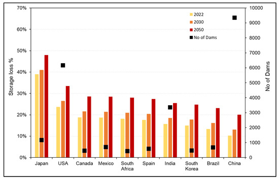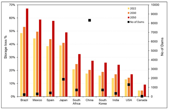 The USA is in second place (Figure 2), having a 34% loss of storage by 2050 in its 7469 large dams considered in the study. The 10% storage loss in 28 years from 2022 will make the storage available in 2050 equal to 580 billion m3. Tullos et al. [29] stated that the USA’s absolute storage capacity was reduced between 10% and 35% due to sedimentation.