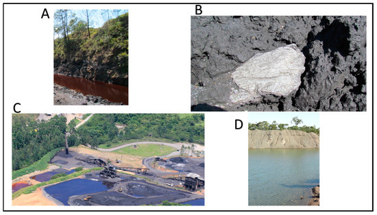 Illustrations of abandoned coal fines areas in the state of Santa Catarina, Brazil. (A) Lauro Muller region during the sampling work; (B) example of coal mine rock that was deposited in the coal fine area; (C) a recent coal beneficiation; (D) coal fines deposit basin in the Siderópolis region.