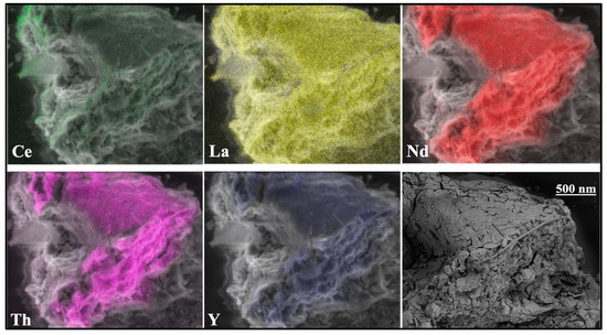 As it can be evinced from Table 1, the minerals containing REEs were monazite and xenotime. These were detected by FE-SEM and HR-TEM owing to the preparation conducted by FIB which allowed precise cuts of several agglomerated clays containing monazite and xenotime in their interiors. In addition to phosphate minerals, multiple inorganic amorphous phases containing REEs were detected (Figure 6). It was also possible to detect some REEs associated with the organic phases present in BFCTs, albeit in lower amounts than the minerals and associated with amorphous inorganic phases. In some cases, when preparing the 136 agglomerated grains of amorphous material containing REEs with FIB, it was possible to confirm that: most cases (98 grains) contained mozanite grains; many agglomerates (31 grains) did not contain minerals such as monazite, but rather organic material that contained smaller portions of REEs; and, in rare cases, the particles (7 grains) were just amorphous material of Al, Si, P, K that contained REEs. It is worth noting that particles were easily detected by FE-SEM/EDS since their sizes were always 1–14 µm. When prepared by FIB-SEM/EDS such particles could be easily studied by HR-TEM/SAED/EDS, as they always fell between 2–190 nm.