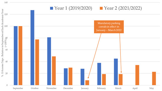 Trend in e-scooter trips on Virginia Tech’s campus in Blacksburg, September 2019–March 2020 and September 2021–May 2022 (Note: for comparison of ridership trends, each period is indexed to September = 100% of each period).