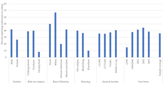 Share of individuals reporting reduced riding in Spring 2022 compared to Fall 2021 by socio-demographics.