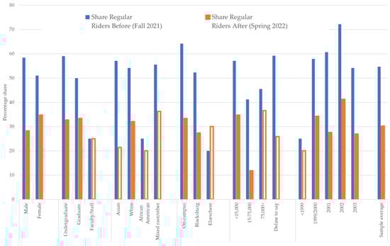 Percentage shares of regular riders for each sub-group (Fall 2021 and Spring 2022). Note: Solid dark-orange bars indicate a statistically significant change (p < 0.05) between Fall 2021 and Spring 2022. Light-orange bars that are not filled indicate changes that were not statistically significant at p < 0.05. Statistical significance was assessed using t-tests based on population proportions (share of individuals ranging from 0–1) as well as chi-square tests for two categorical variables.