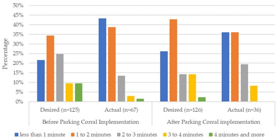 To answer our second research question about egress times, the panel surveys also asked riders to report their desired egress time from e-scooters to destinations, that is, how long they were willing to walk after parking the scooter, as well as their actual egress time, or how long their walk took. This allowed us to identify changes in time sensitivity for the entire sample—distinguishing those who reduced their riding and those who continued riding. For those who continued riding, we were also able to compare self-reported actual e-scooter egress time before and after the introduction of the e-scooter corrals.