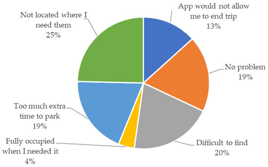 In Spring, we asked respondents for feedback about their experience using the parking corrals, particularly about issues with using them. The question asked, “Please tell us about any issues or problems you faced when using parking corrals,” and respondents were able to select all that applied from a list that we provided, or to report a problem in an open comment box. Responses are shown in Figure 6. Although about one-fifth of respondents reported no problems (19%), the majority experienced some trouble: the corrals were not located where the user needed them (25%), were difficult to find (20%), took too much extra time to use when parking (19%), trouble ending the trip within the app (13%), or were fully occupied when the user needed to park (4%). Several riders made comments about their trouble ending rides, for example, taking the e-scooter to the corral location but not being able to end the ride due to the app not recognizing the e-scooter’s correct location and/or not acknowledging the connection to the permitted geofence. A bad experience parking an e-scooter, especially if it caused the rider to be late arriving at their destination, could affect perceptions of e-scooters as a reliable mode.