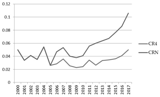 Market concentration index, also known as “market concentration rate”, refers to the total market shares of the top N largest companies in the relevant market of the industry. Market concentration is the most basic and important factor determining the market structure, reflecting the degree of competition and monopoly in the market. Within the market’s structure, the level of market concentration captures how much certain enterprises influence the output, sales volume, and assets of the industry. Generally, market concentration is measured as the proportion of the prime operating revenue of the major companies in the industry to the total sales volume in the industry. This study uses the concentration ratio to investigate market structure. represents the four largest companies in the industry and represents the eight largest companies in the industry. According to Bain’s classification of industry concentration, industry concentration is divided into two categories: oligopoly ( ≥ 30) and competition ( < 30%), where a market share exceeding 70% for the top four companies is classified as an extreme oligopoly, and a market share between 40% and 70% for the top four companies is a low concentration oligopoly. Competitive industries are subdivided into low concentration competition (20% ≤ < 30%) and decentralized competition ( < 20%) [8].