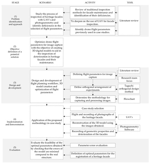 In the second stage, the objective of a potential solution was defined. This objective was based on a proposed methodology that optimises the UAV flight parameters for the capture of images of vertical structures, with the goal of obtaining a realistic virtual model that can aid in the visual inspection and subsequent maintenance of a heritage façade.