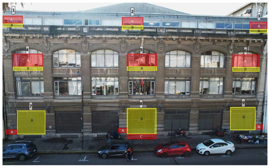 9]. During the inspection of heritage façades, the different types of damage or deterioration that affect the structure are recorded. The condition of each face of the building is verified, first focusing on the deterioration that directly affects the structural stability and then reviewing those that affect the aesthetics; a great amount of information is recorded in the process [