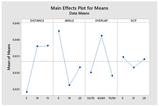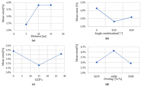 28]. Although the associated parameters can have an influence, they are also associated with the uncertainties inherent to the flight (practical handling by the user) and the characteristics of the algorithms of the photogrammetric reconstruction software. Although they seem very relevant, the studies (including this one) have discarded these other aspects since their influence is minor, especially considering the practical purposes of the research and the possibilities of users to influence more optimal flights and reconstructions [